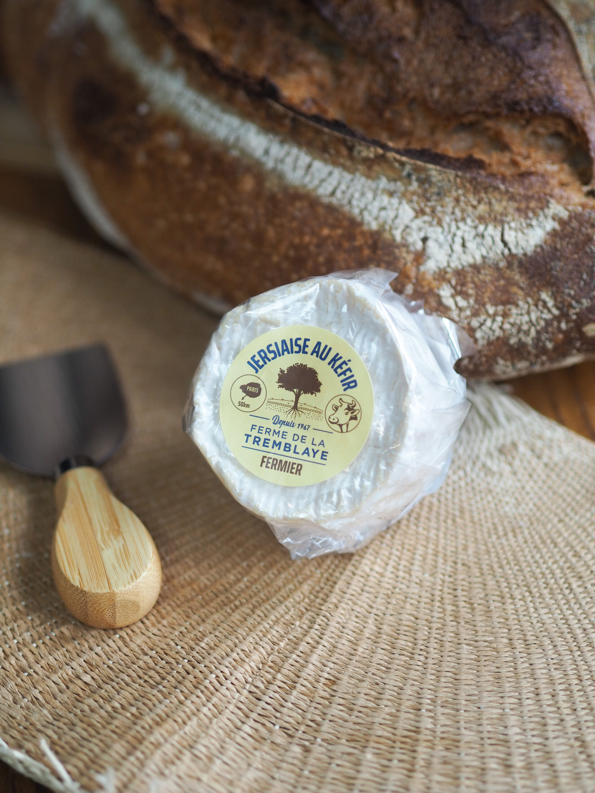 Le Jersiaise au Kéfir Fermier est un fromage biologique à pâte molle et croûte fleurie. Fabriqué à partir de lait pasteurisé de vache Jersiaise, ce fromage présente une croûte fine et plissée, recouverte d’un léger duvet blanc. Sa pâte ivoire offre une texture dense et légèrement crémeuse sous la croûte, délivrant des saveurs douces de crème avec une pointe d’acidité. L’utilisation du kéfir, un ferment naturel originaire du Caucase reconnu pour ses vertus digestives, confère à ce fromage une fraîcheur unique. Son affinage optimal est d’environ 30 jours, mais il peut également être apprécié plus affiné selon les goûts.