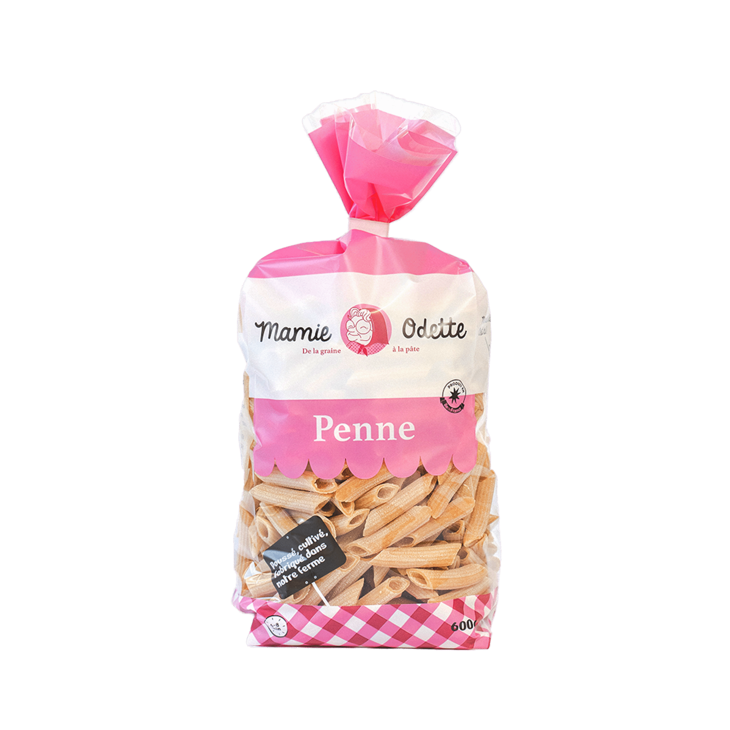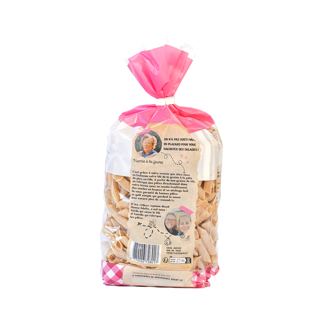 Les Penne de Mamie Odette sont fabriquées à Flexanville (Yvelines – 78), à partir de blé français cultivé sur la ferme. Extrudées dans des moules en bronze selon tradition, ces pâtes rigate offrent une excellente tenue à la cuisson et sont parfaites pour accueillir sauces généreuses.