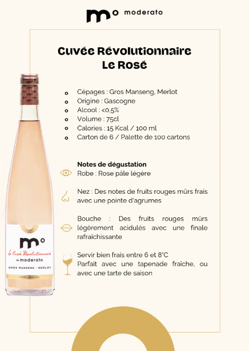 Le Rosé Sans Alcool Cuvée Révolutionnaire Merlot-Gros Manseng de Moderato est une boisson fraîche et fruitée, idéale pour ceux qui recherchent une alternative sans alcool mais pleine de saveurs. Ce rosé révèle des notes délicates de fruits rouges et une belle vivacité, parfait pour les moments de convivialité. Son équilibre et son élégance en font un choix raffiné pour ceux qui souhaitent profiter d’un apéritif léger et pétillant sans compromis.