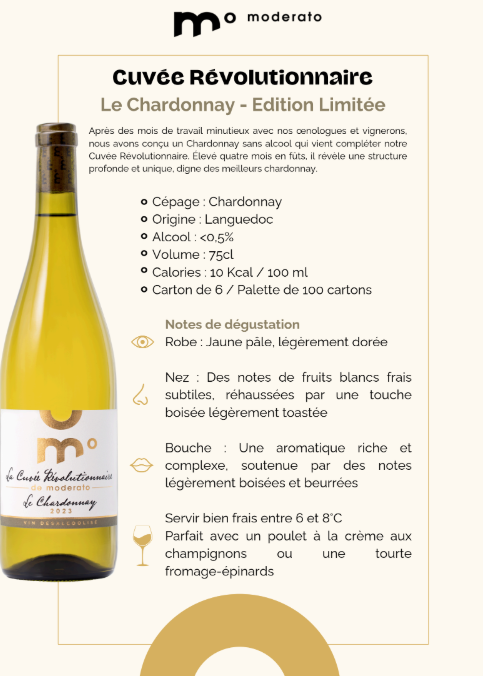 Le Vin Blanc Sans Alcool Chardonnay – Cuvée Révolutionnaire édition limitée de Moderato est une alternative élégante aux vins traditionnels. Avec ses arômes subtils de fruits frais et une belle acidité, il offre une expérience rafraîchissante et équilibrée, parfaite pour les moments de convivialité. Cette cuvée exceptionnelle, sans alcool, combine finesse et légèreté pour un apéritif raffiné.