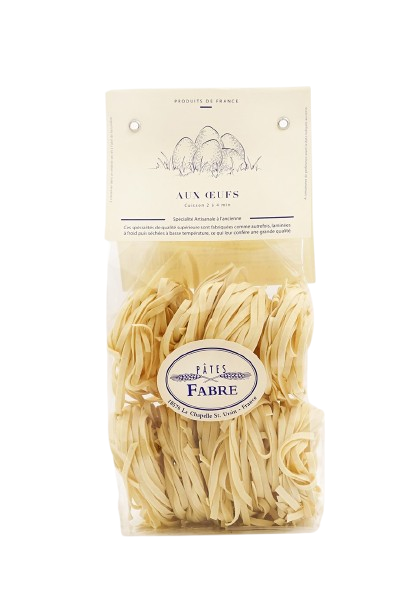 Les Tagliatelles Nids 4 mm aux œufs de Maison Pâtes Fabre sont des pâtes artisanales d’exception, préparées avec des ingrédients de qualité et un savoir-faire traditionnel. Leur texture délicate et leur richesse en œufs leur confèrent une saveur gourmande et une tenue parfaite à la cuisson. Idéales pour accompagner vos sauces préférées et sublimer vos plats !